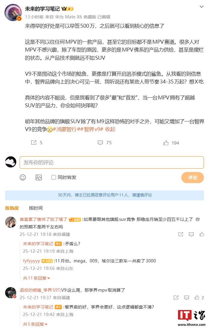 值得一提的是,博主还针对智界 MPV 此前曝出的 34-35 万起的售价进行了否认。再结合博主后续提到的“智界品牌向上的决心”来看,这款 9 系旗舰 MPV 的起售价格有望来到 40 万元以上。